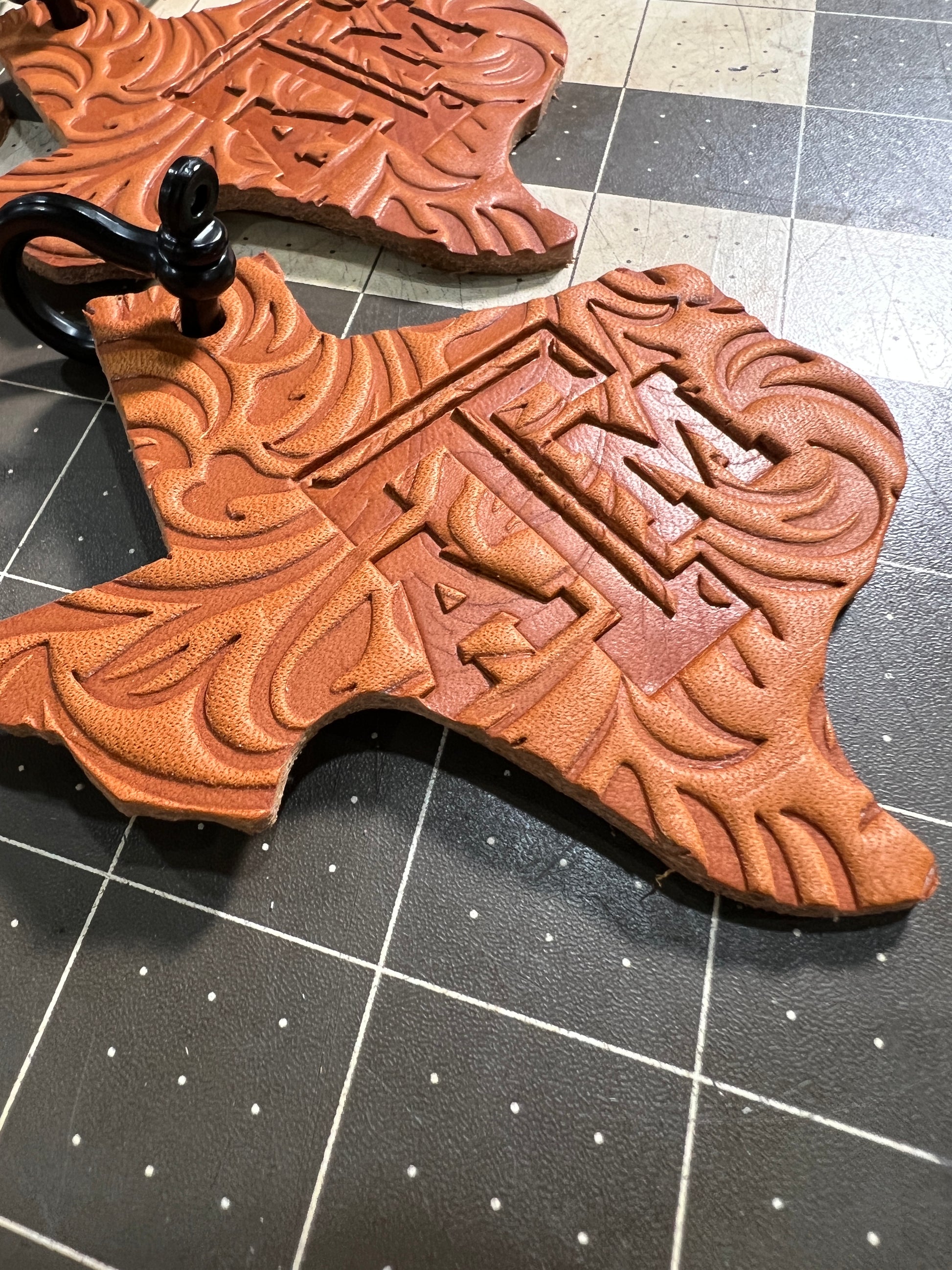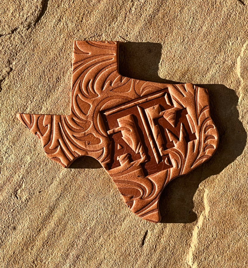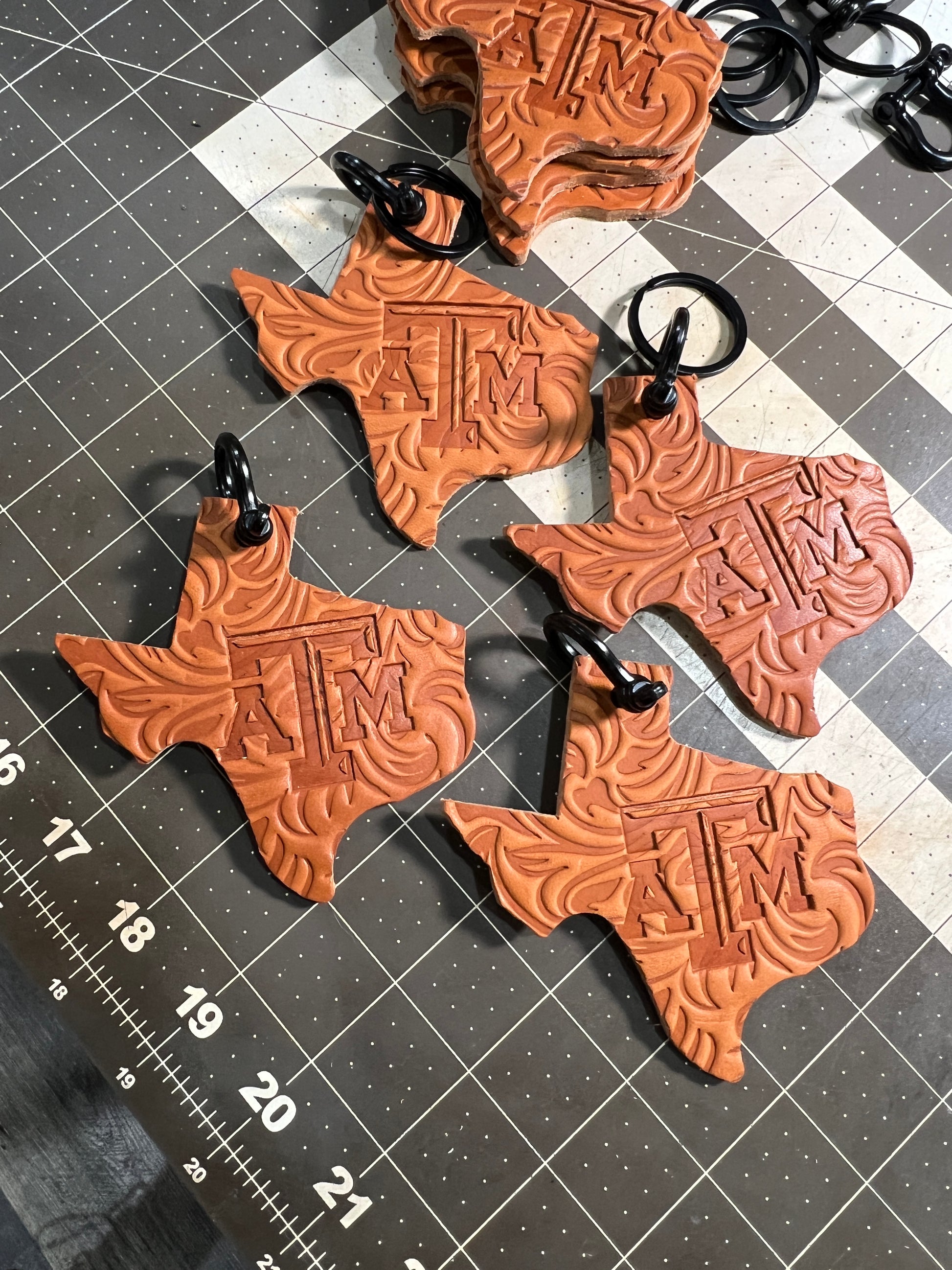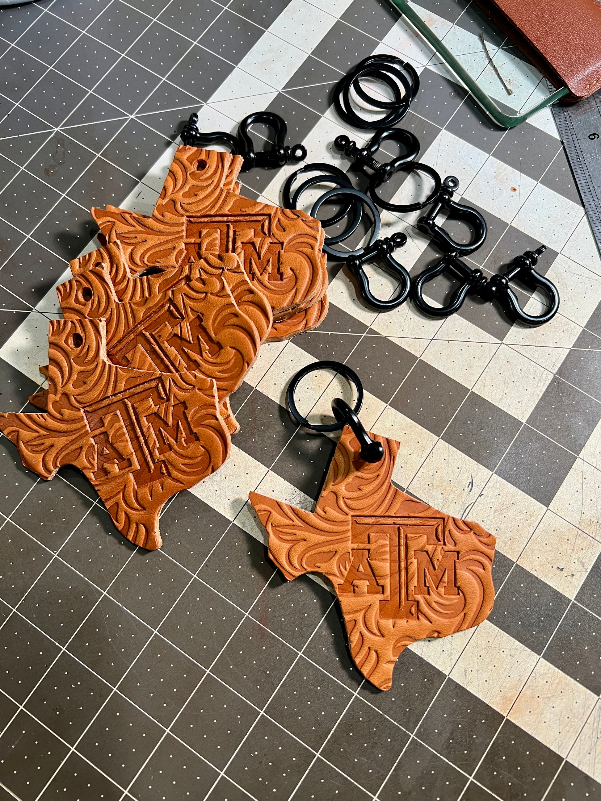 Show off your Texas A&M pride with this handcrafted all-leather keychain! Shaped like the Lone Star State, this keychain features the iconic A&M logo prominently embossed in the center, surrounded by intricate, swirling patterns that highlight the rich, burnt orange leather. Durable and stylish, it comes with a sturdy metal key ring to keep your keys secure. Perfect for Aggies fans, alumni, or anyone who loves a touch of Texan spirit. Add this unique accessory to your collection and carry your school pride wherever you go!