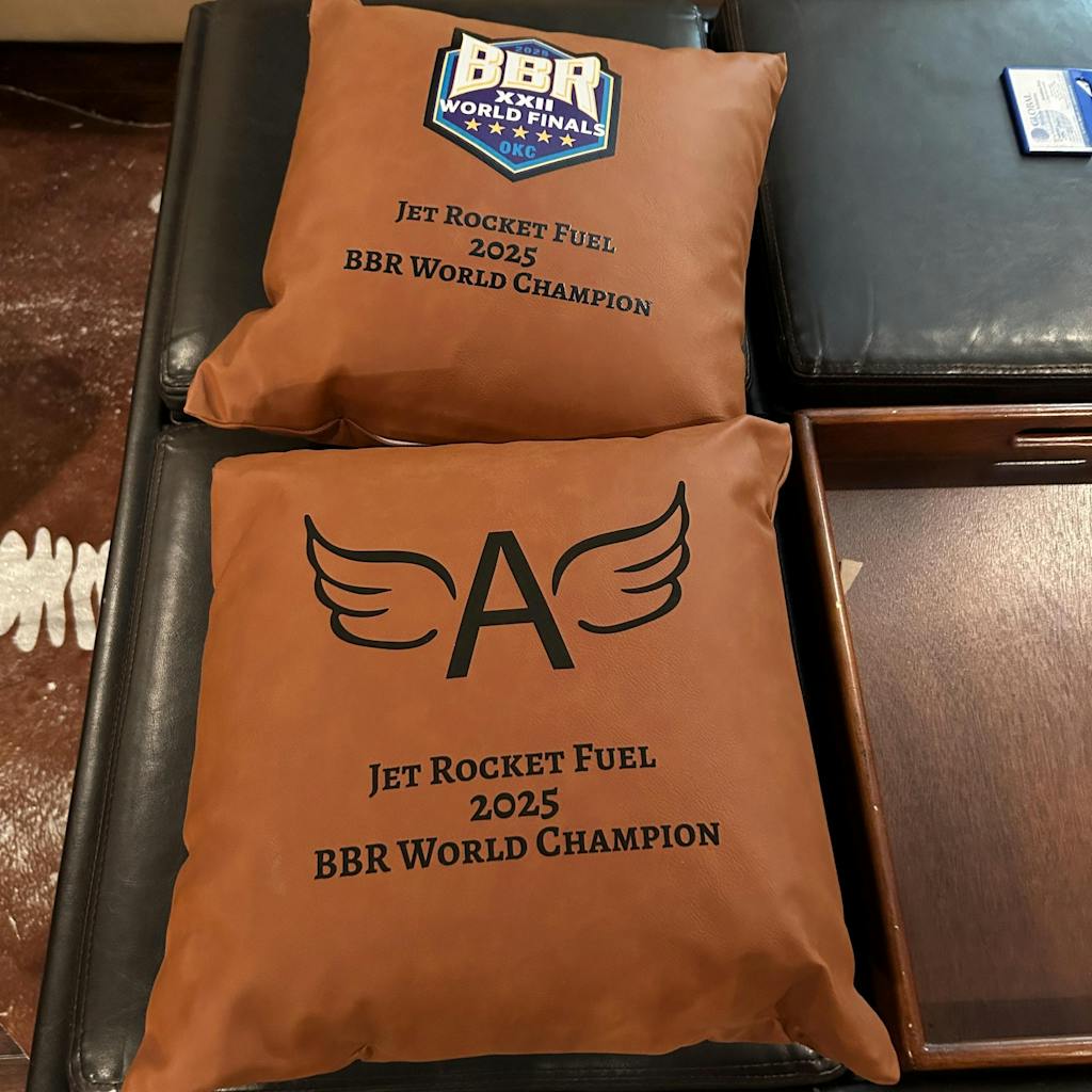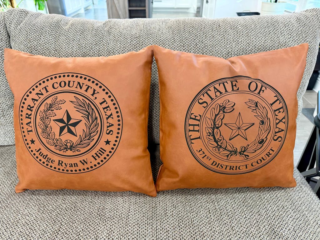 Crafted in a rich saddle tan brown leatherette with black engraving, each pillow arrives fully stuffed and ready to display.