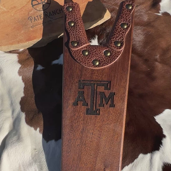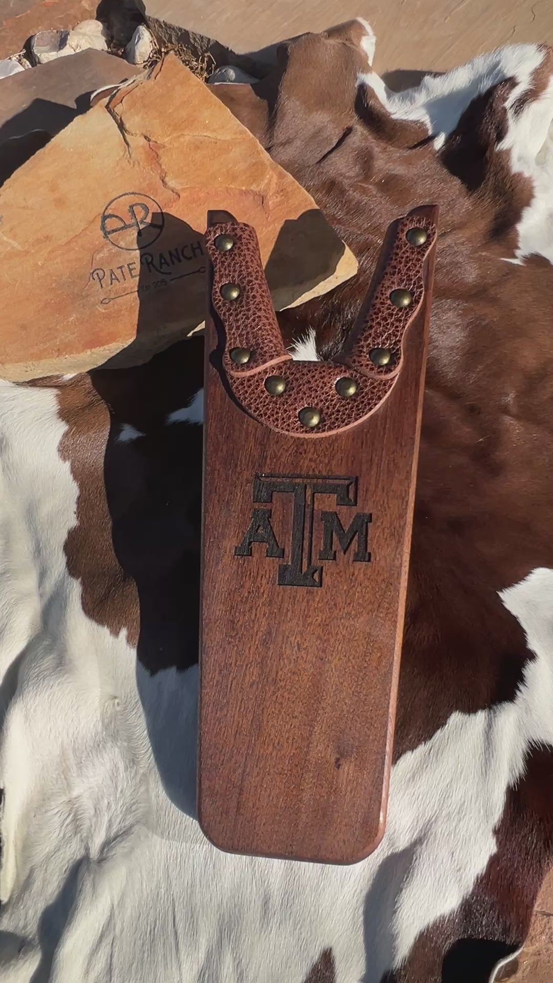 This premium Black Walnut Boot Jack is expertly designed to add both ease and elegance to your boot removal. Made of rich black walnut wood, it boasts an intricate laser-engraved design for a touch of sophistication. With durable water buffalo leather accents and antique brass rivets, this boot jack is not only functional but also has a hint of rugged charm. You can even customize it with initials or personalized designs for a unique touch. Not just for practical use, this boot jack can also be used as a personalized award to commemorate special milestones. Crafted to last by Pate Ranch, these boot jacks have a larger size than most options on the market, measuring 14" x 5.5" at the top. The leather used on the opening is 100% water buffalo, while the bottom is made of veg tan leather. Perfect for daily use or as a thoughtful gift for boot lovers.